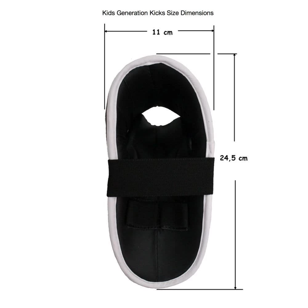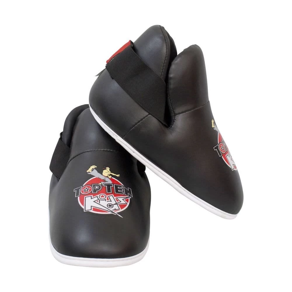 The Top Ten Kids Kick foot guard is especially designed for young children. Sizes fit boys and girls aged 5 and over. They are comfortable and durable, and provide great protection. The pre-shaped kicks are padded with soft PPS foam to protect the sensitive foot area from bruises and covered with a smooth surface of washable imitation leather and a reinforced step edge.